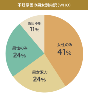 図に示す通り、不妊原因のうち、男性不妊症が原因となるケースは48%とほぼ半数を占めております。