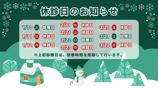 当院の年末年始休暇は、12月28日(日)~1月4日(日)までとなります